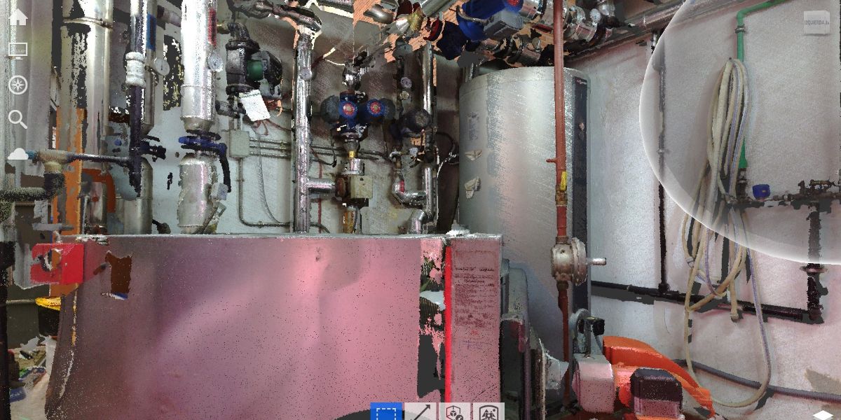 Se trata de una pequeña sala de calderas sobre la que se desea obtener un gemelo digital de alta precisión, ya que sobre ella se va a llevar a cabo una nueva implantación de maquinaria, y se requiere que todas las conducciones e instalaciones queden plasmadas de forma precisa. Para ello, se recurre, una vez más, a un escaneado láser para obtener una nube de puntos sobre la que poder trabajar posteriormente.