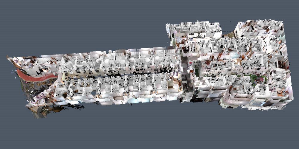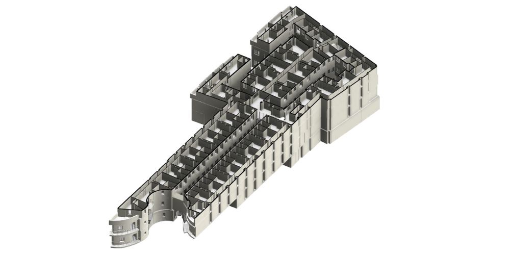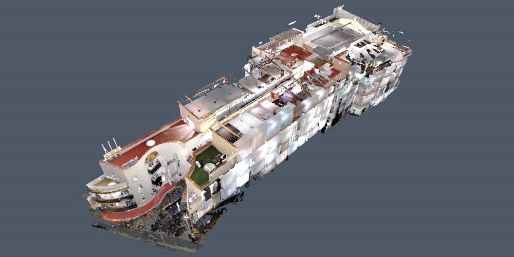 El objetivo de este nuevo escaneado es el de obtener un modelo 100% fiel a la realidad constructiva del hotel, ya que se pretende proceder a su reforma, y es que, al tratarse de un edificio con una antigüedad importante, lo reflejado en los planos no siempre se corresponde a la realidad. Es por ello que disponer de un modelo BIM a partir de una nube de puntos, es de vital importancia para poder extraer mediciones de forma precisa y sin desviaciones de importancia, pues en este tipo de edificaciones, no suelen abundar las líneas paralelas, máxime cuando nos encontramos ante una distribución tan singular como la de este hotel.